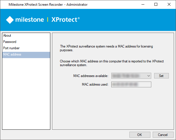 For licensing purposes, you must also select a MAC address. You can choose between all MAC addresses available on the computer with XProtect Screen Recorder installed.