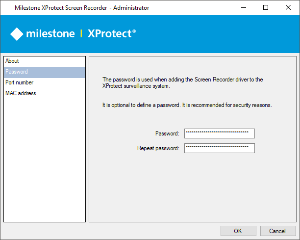 It is important that only the relevant recording server connects to and request video from a computer with XProtect Screen Recorder installed. You do this by entering a password of your choice in the text fields displayed in the illustration below.