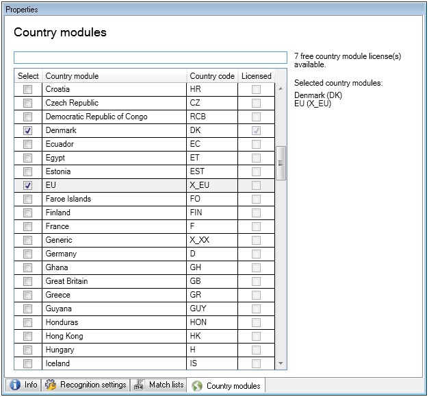 - Sélectionnez les modules de pays que vous souhaitez utiliser avec votre caméra LPR (voir Onglet Modules de pays)