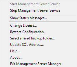 - Dans la zone de notification, cliquez avec le bouton droit sur l’icône de la barre d’état Management Server Manager. Un menu contextuel s'affiche.