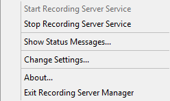 - Dans la zone de notification, cliquez avec le bouton droit sur l’icône de la barre d’état Recording Server Manager. Un menu contextuel s'affiche.