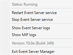 L’icône de la barre d’état Event Server Manager indique l’état du service du Event Server, par exemple Exécution en cours. Par le biais de cette icône, vous pouvez démarrer, arrêter ou redémarrer le service Event Server. Si vous arrêtez le service, certains parties du système ne fonctionneront pas, et notamment les événements et les alarmes. Cependant, vous pourrez continuer à afficher et enregistrer des vidéos. Pour de plus informations, voir Arrêt du service Event Server.
