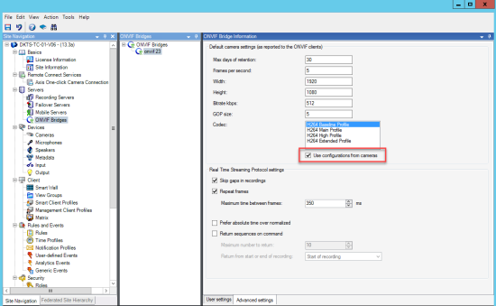 Vous pouvez utiliser GetRecordingSummary et/ou GetMediaAttributes pour obtenir l’échelle de temps du premier et du dernier enregistrement, mais vous devez d’abord activer le paramètre Utiliser les configurations des caméras sur l’onglet Paramètres avancés sur le module d’extension Milestone ONVIF Bridge dans le XProtect Management Client.