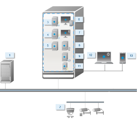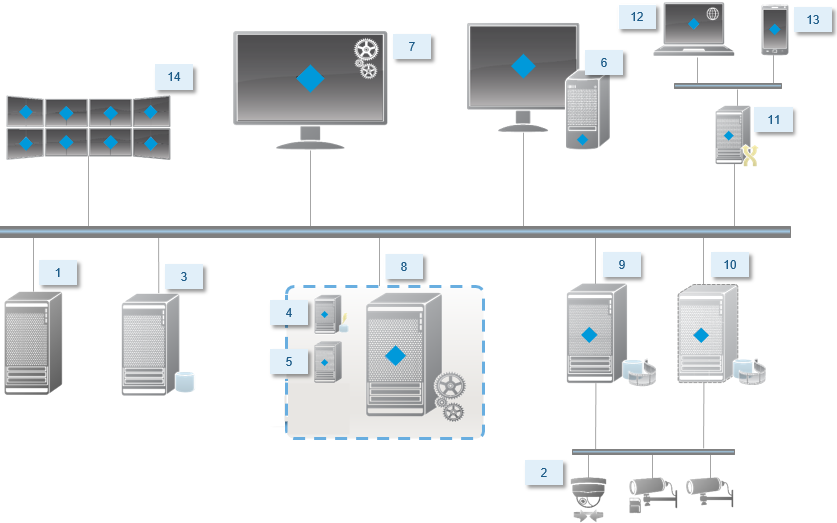 The recording server retrieves video streams from the cameras, which results in a constant load on the network. Clients that display video consume network bandwidth. If there are no changes in the content of the client views, the load is constant. Changes in view content, video search, or playback, make the load dynamic.