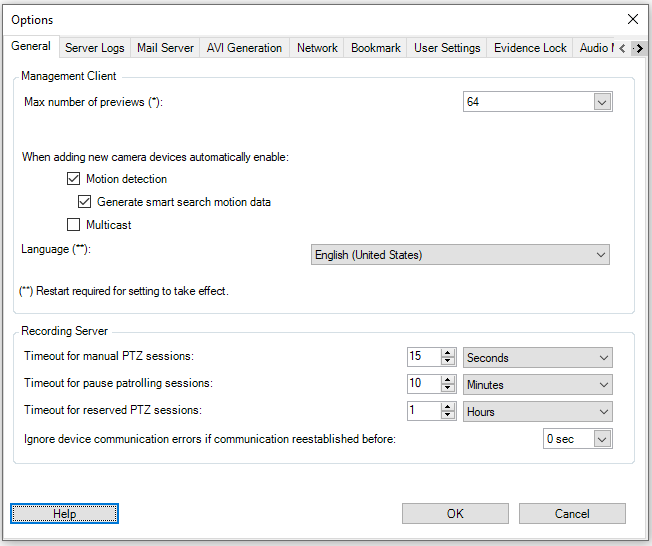 On the General tab, you can specify general settings for the Management Client and the recording server.