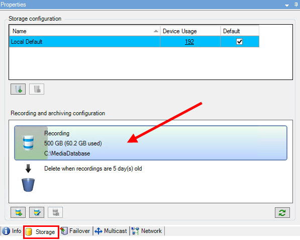 On the Storage tab, you can set up, manage and view storages for a selected recording server.