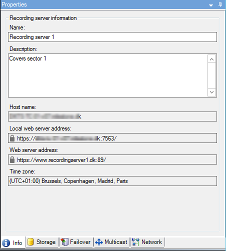 You can view the host name and addresses. The padlock icon in front of the web server address indicates encrypted communication with the clients and services that retrieve data streams from this recording server.