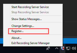 - When the recording server is not running, right-click the Recording Server Manager tray icon and select Register.
