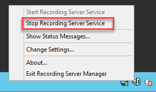 - On the recording server, right-click the Recording Server Manager tray icon in the notification area and stop the Recording Server service.