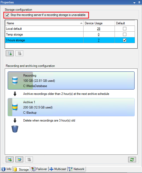 For recording storages and archives, the horizontal bar shows the current amount of free space. You can specify the behavior of the recording server in case recording storages become unavailable. This is mostly relevant if your system includes failover servers.