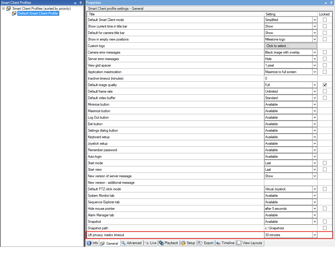 - On the General tab, locate Lift privacy masks timeout.
