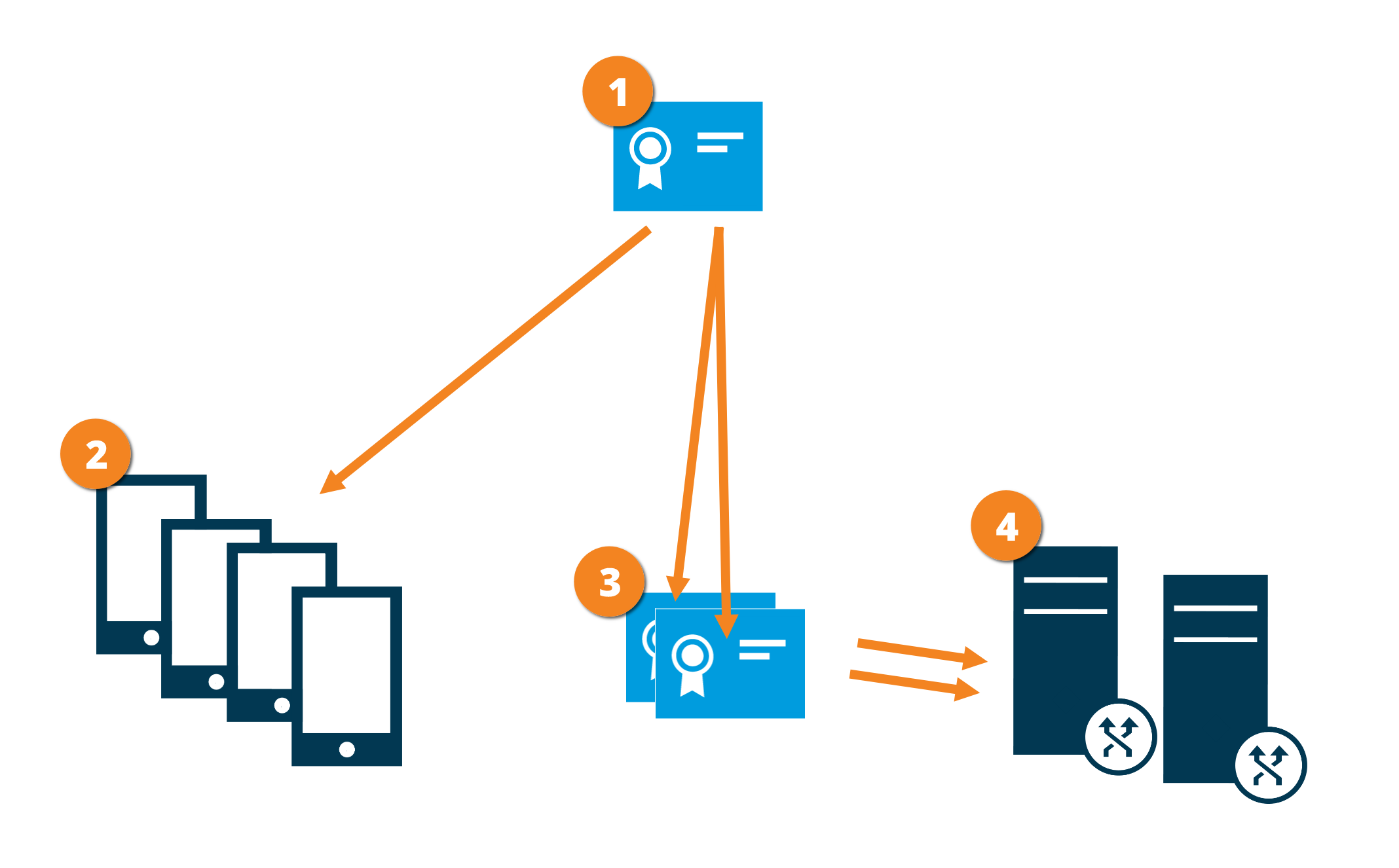 The graphic illustrates the basic concept of how certificates are signed, trusted, and distributed in XProtect VMS to secure the communication with the mobile server.