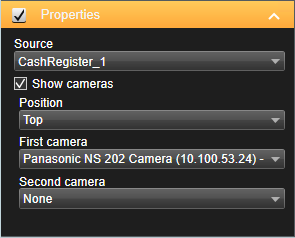 プロパティを展開し、カメラを表示するチェックボックスを選択して、トランザクションソースに関連付けられたカメラを追加します。デフォルトでは、設定で最初にトランザクションソースに追加されるカメラが選択されます。