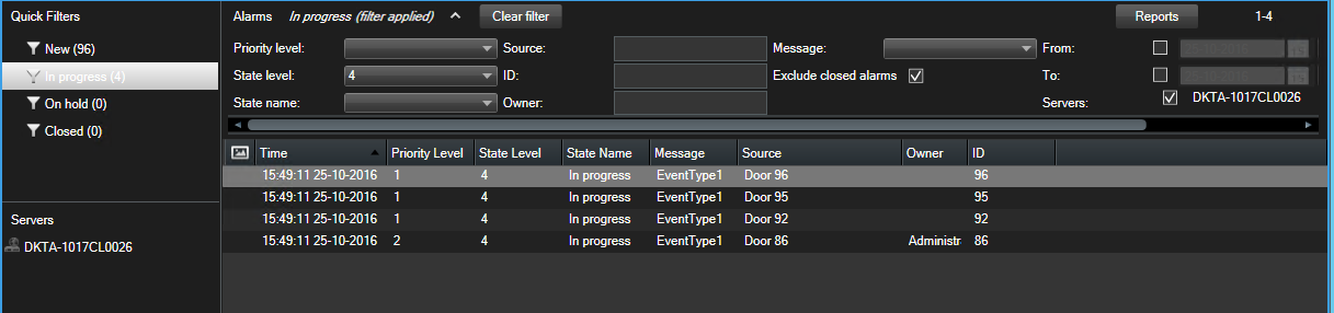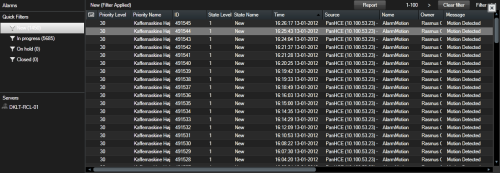 アラームには以下の状態があります。新規、進行中、保留中、終了。各アラームの状態は[状態]列の[アラームリスト]で見ることができます。[フィルター]ペインでは、特定の基準に従ってフィルタリングできます。最初はすべてのアラームが[新規]状態ですが、アラームが処理されると、その状態が更新されます。