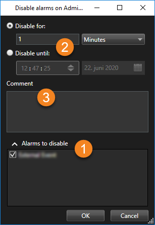 で、アラームを無効にするイベントのタイプを指定します。 - いつまで、またはどれくらいの期間、選択したイベントタイプのアラームを無効にするのか指定します