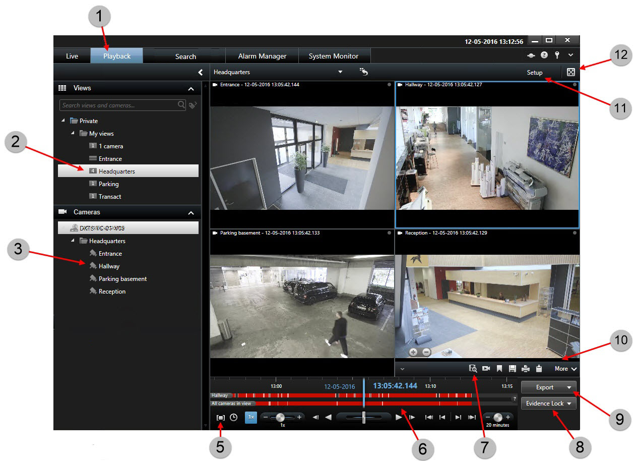 ビューに番号が割り当てられている場合は、キーボードのショートカットを使用してビューを選択できます。[ライブ]および[再生]タブの設定モードでビューに番号を割り当てます。設定モード オーバービューも参照してください。