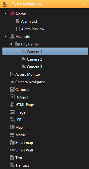 - Smart Wall - XProtect Smart Wallがシステム管理者によって設定されている場合は、Smart Wallの概要をビューに追加すると、Smart Wallに表示される内容を管理できます。 XProtect Smart Wall (説明付き)を参照してください。