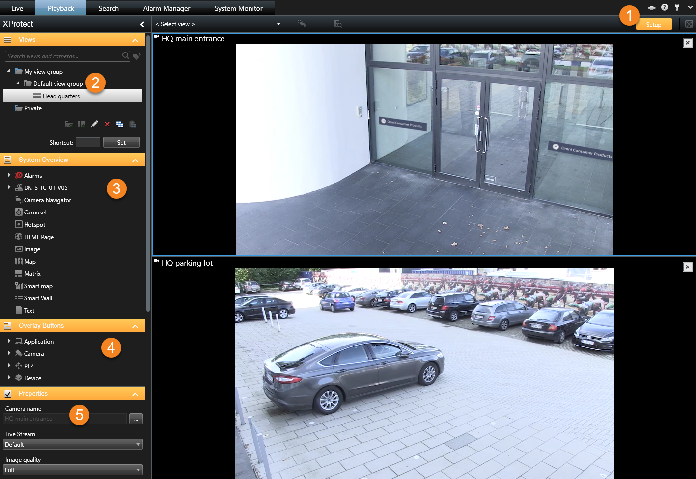 設定モードでは、デバイスと他のタイプのコンテンツ向けにビューを作成できます。また、オーバーレイ ボタンを追加し、カメラや他のタイプのデバイスのプロパティを設定できます。