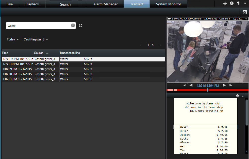 [Transact]タブでは、検索とフィルタリングを使用してトランザクションを調査し、ビデオ録画とレシートを組み合わされたビューで表示します。
