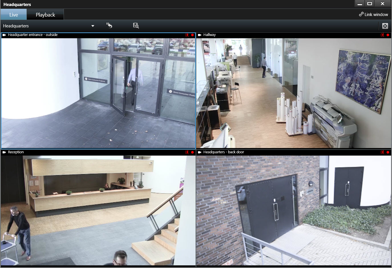 XProtect Smart Clientのメインウィンドウを背景に維持しながら、異なるウィンドウまたはディスプレイに個別のビューを送信できるので、複数のビューを同時に見ることができます。選択されたカメラまたはアイテムは常に青い境界線で表示されます。