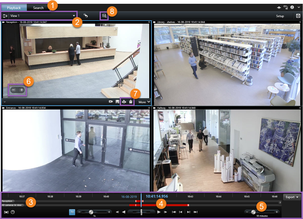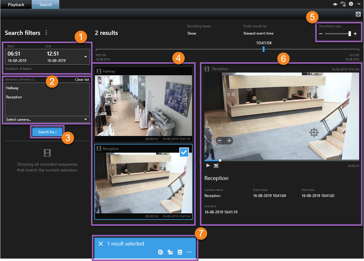 [再生]タブでエクスポートされた録画を調査し、[検索]タブで検索を実行します。 |
