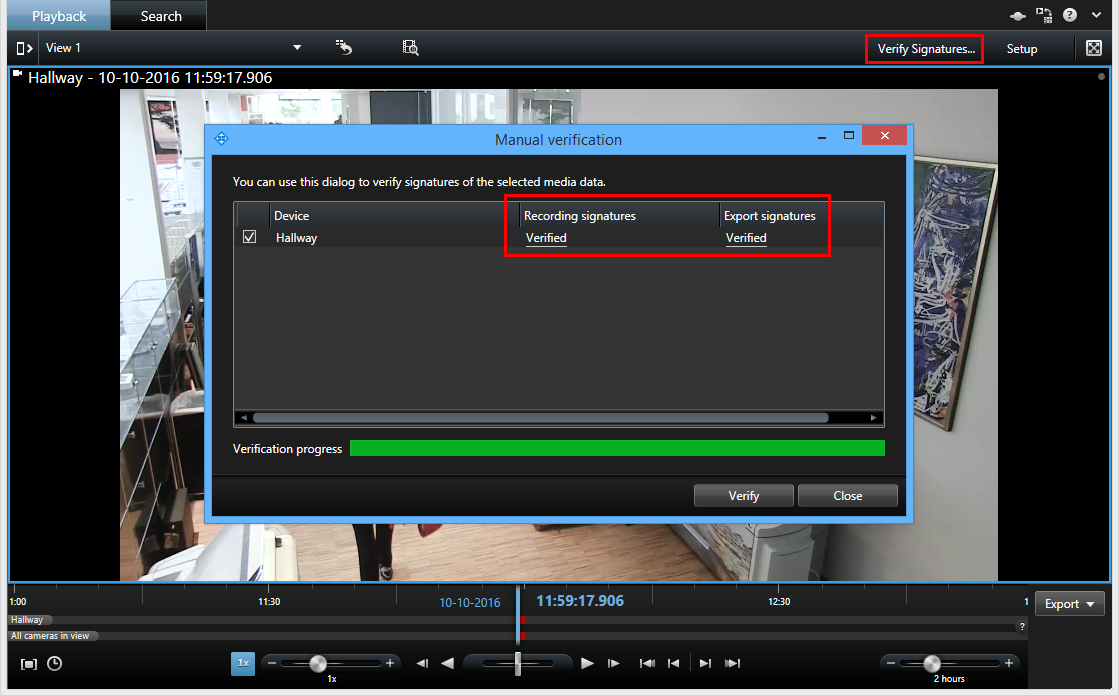 - [検証]をクリックして検証プロセスを開始します。システムは録画の署名とエクスポートの署名の真偽を確認します。