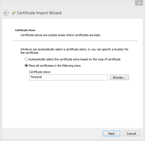 - Place the file in the Certificate Store: Personal and click Next.