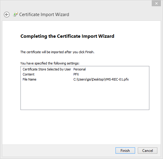 - Verify the information and click Finish to import the certificate.