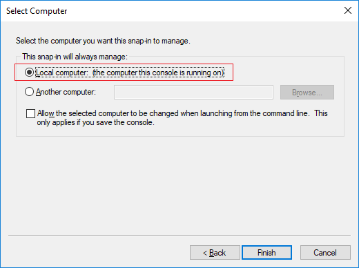 - Select Local computer as the computer that you want the snap-in to manage and click Finish.