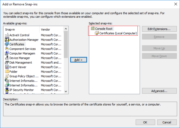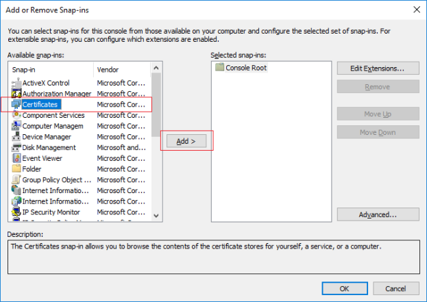 - Select the Certificates snap-in and click Add.