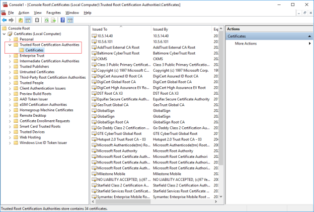 - Verify that the certificate is listed in the center view of the Trusted Root Certification Authorities subtree.