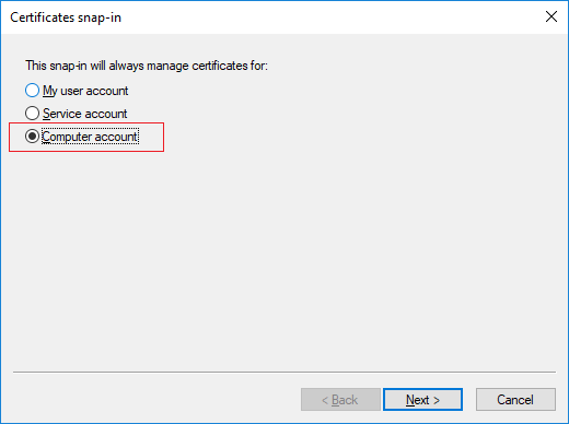 - Select that the snap-in must manage certificates for the Computer account.