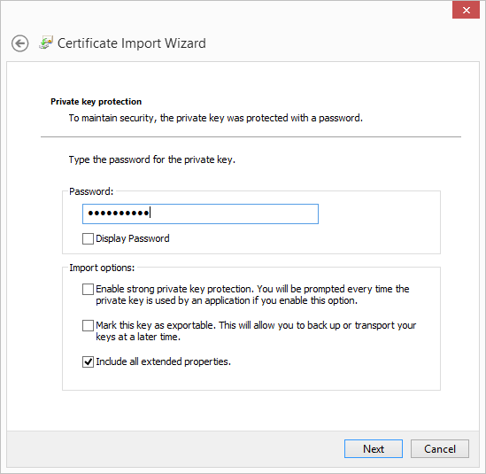 - Enter the password for the private key that you specified when you created the server certificate, and click Next.