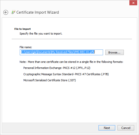 - Browse to the certificate file and click Next.