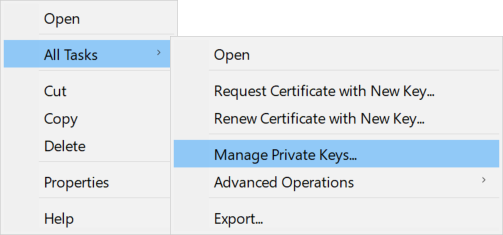 - To allow a service to use the private key of the certificate, right click the certificate and select All Tasks > Manage Private Keys.