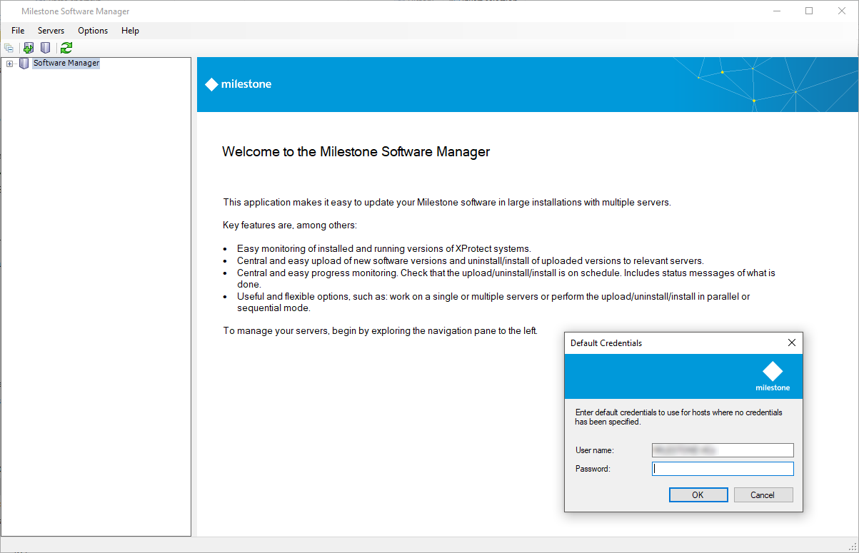 Once you have launched Milestone Software Manager, before you can start working, you must enter default credentials for the remote machines on the network.