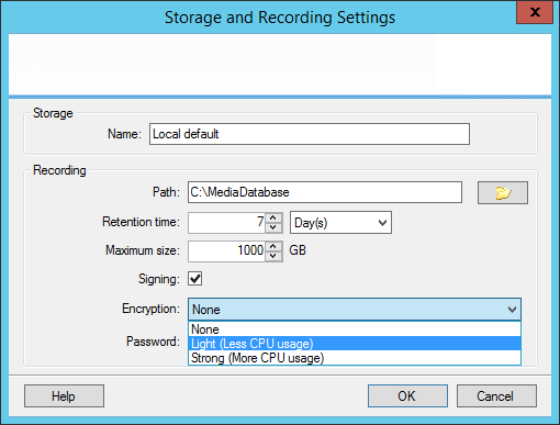 You can secure your recordings by enabling encryption on your recording servers' storage and archives. You can choose between light and strong encryption. When you enable encryption, you must also specify a related password.
