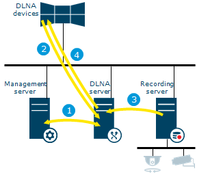 Die folgende Abbildung zeigt eine hochstufige Ansicht der Interoperabilität zwischen einem DLNA-Gerät und XProtect DLNA Server im XProtect-System.