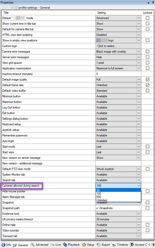 设置搜索期间允许的摄像机数量 您可以配置操作员可以添加到 XProtect Smart Client 的搜索中的摄像机数量。默认值为 100。如果超出摄像机限制,则操作员会收到警告。 在 XProtect Management Client 中,展开客户端 > Smart Client 配置文件。 选择相关的配置文件。 单击常规选项卡。 在搜索过程中允许的摄像机中,选择以下值之一:50100500不受限制 保存更改。
