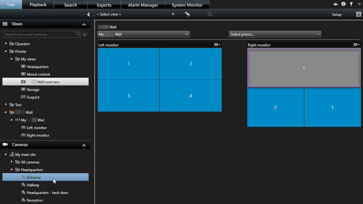 通过将视图发送到 Smart Wall 监视器,可以与其他 Smart Wall 操作员共享整个视图。 然后,该监视器上当前显示的内容将替换为视图的内容。