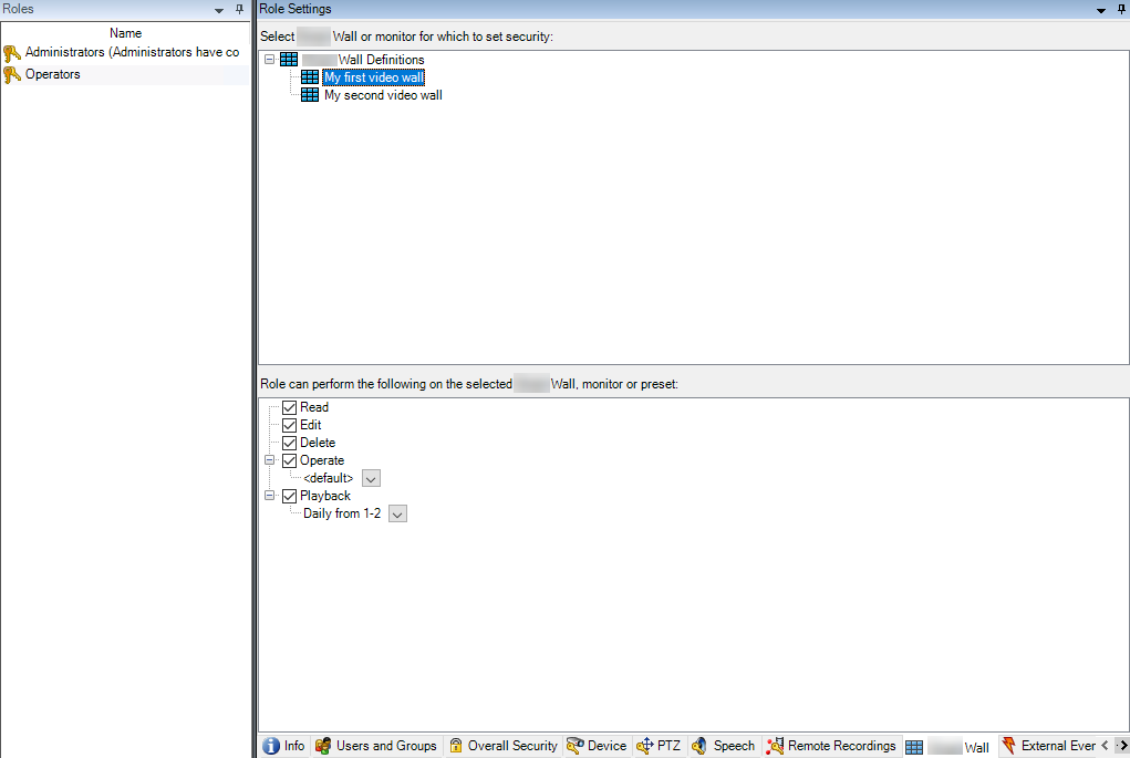 启用在 XProtect Smart Client 的电视墙中播放记录数据的权限。 您可以将播放与定义何时应用用户权限的时间配置文件相关联。 |