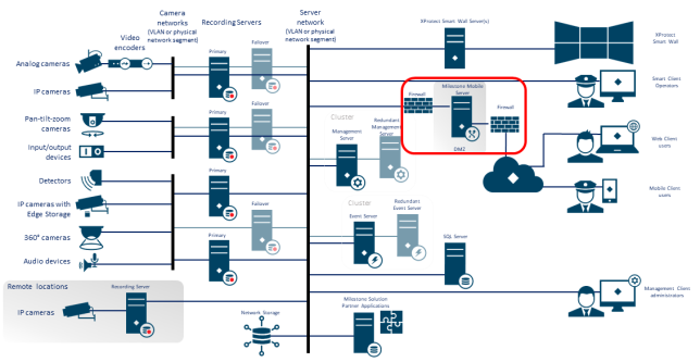 If possible, expose only the XProtect Mobile server component to the Internet, and locate it in a demilitarize zone (DMZ) with firewalls on both sides. This is illustrated in the following figure.