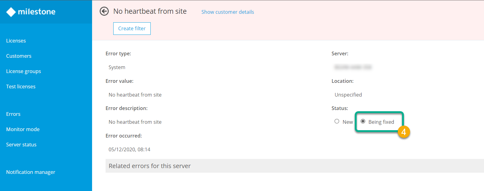 Milestone Customer Dashboard checks the reported errors every 30 minutes and automatically removes the resolved errors from the main list. All errors arrive with status New. If you are working on a specific error, you can manually change its status to Being fixed.
