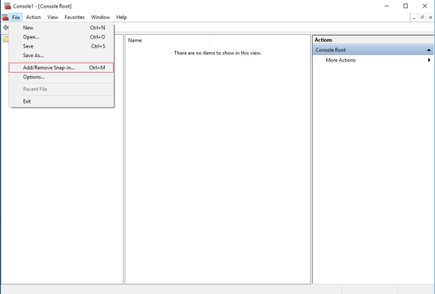 - In the Microsoft Management Console, from the File menu select Add/Remove Snap-in….