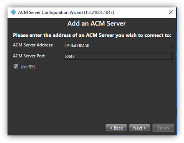 Launch the wizard and click Next. At the Add an ACM Server step, the ACM Server Address field is required and should be entered as the host name of the CCure 9000 host server.
