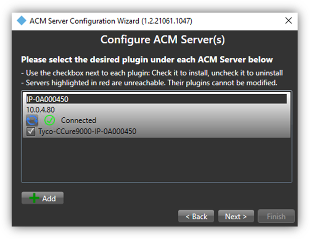 After the wizard validates the ACM Server address, a green checkmark next to the text Connected indicates a successful connection. Select the checkbox next to the plugin that will be installed. The plugin should be named: