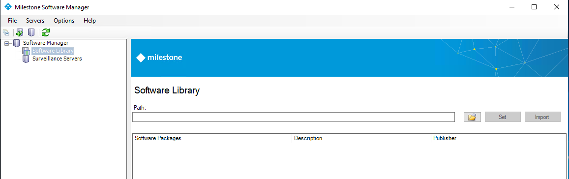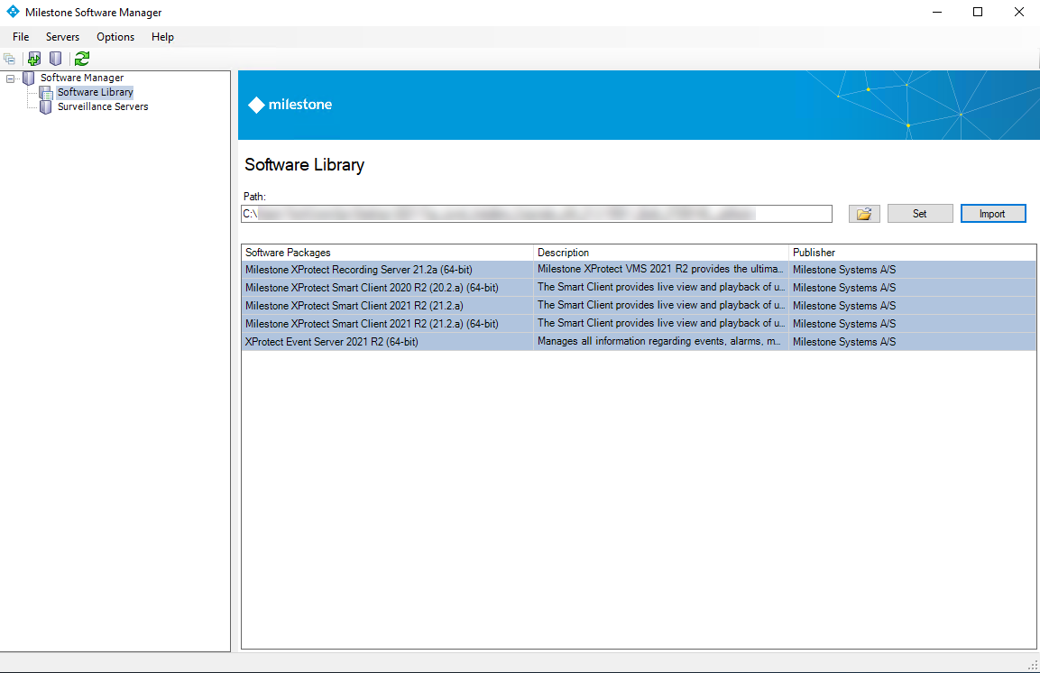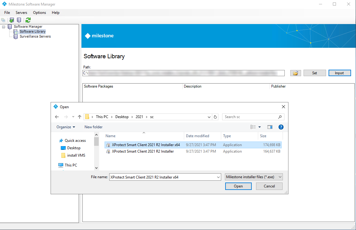 To work with software packages, double-click each one to unpack them to your destination folder. In Milestone Software Manager, point your software library path to the folder.