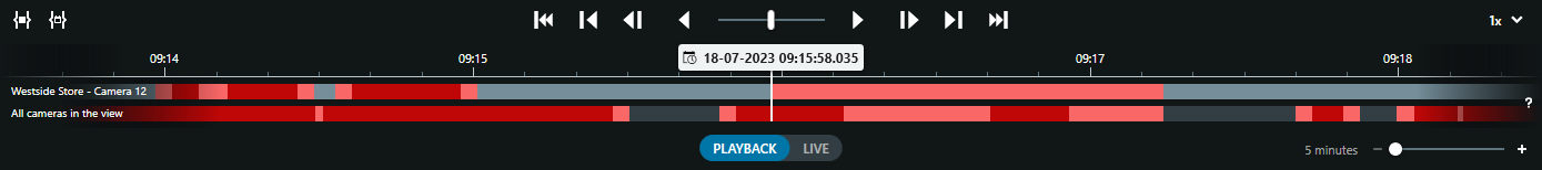 The possibility to retrieve the Edge Storage recordings is visualized by replacing the normally black space between recordings on the timeline with a grey color. The grey color indicates that there might be recordings on the Edge Storage camera that can be retrieved by the XProtect Smart Client user.