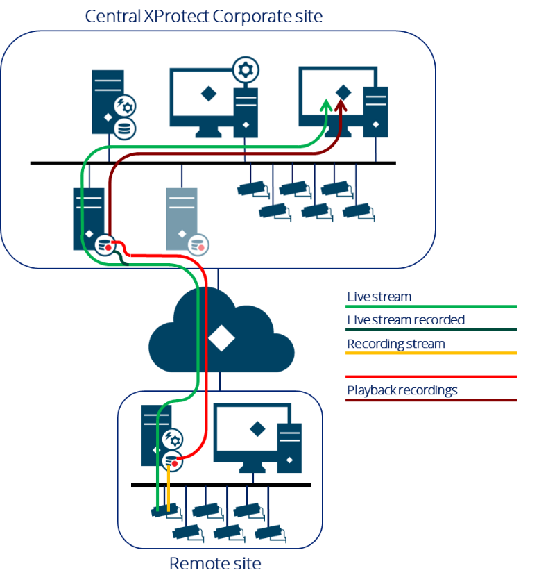 Furthermore, when recording on both the central and remote sites, Scalable Video Quality Recording (SVQR) can be used to record low-quality recordings on the central XProtect Corporate site, and then later retrieve high-quality recordings from the remote site, for instance on certain events or on manual user request (See the SVQR section).