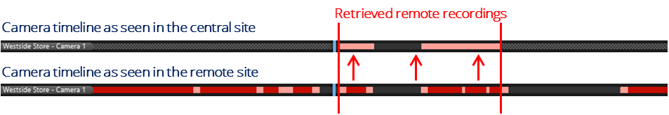 The timeline illustrates the difference in recorded media on the central XProtect Corporate site and the remote interconnected site. For this specific illustration, recording is enabled on the central XProtect Corporate site, but no rules have been configured to trigger recording – The users, however, can retrieve recordings when needed.